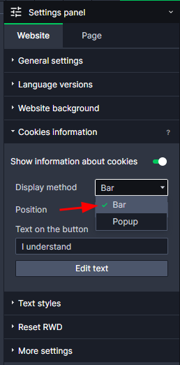It's a good practice to inform visitors that your website uses Cookies. In Webwave - white label website builder with no coding - you can easily add a Cookies notification to appear at the top or bottom of your website or you can turn it off completely.