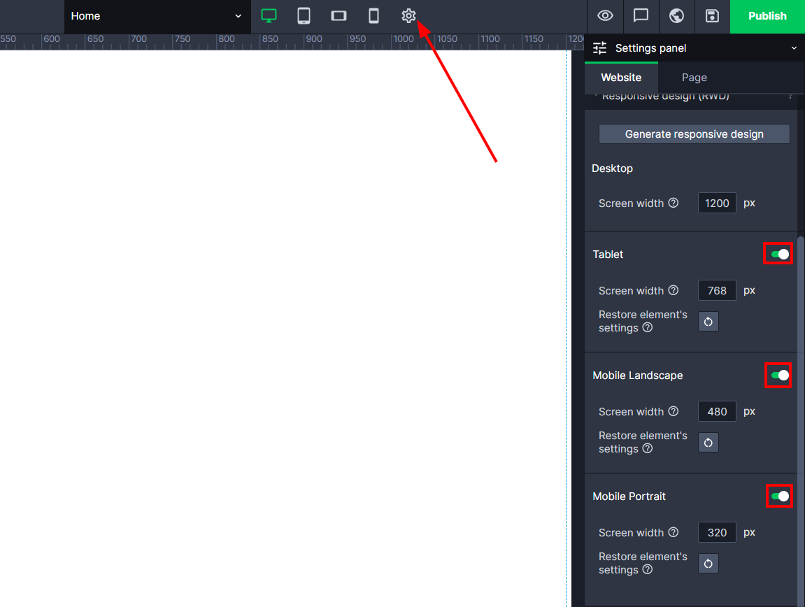 On the top bar, click on the gear icon, which takes you to the "Settings panel" -> "Site" -> "Responsive design (RWD)" Next to the different RWD modes, we move the slider to the right side.