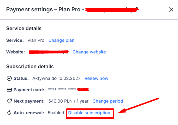 If you make purchases in WebWave using a payment card, it is automatically saved in the system and the subscription for your domains and premium plans is also enabled. If you do not want your domain and premium plans to be automatically paid, follow this guide.