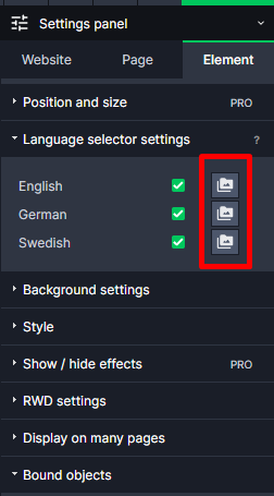 Enter languages menu and in the Settings Panel go to "Language selector settings". Choose the languages, from previously created languages versions of your website, will be displayed in the menu. You can also change the thumbnails of the selected languages.