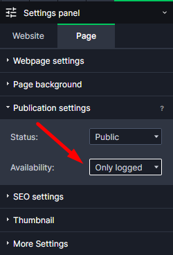 In order to give an access of the selected webpage to only logged in users, open the Settings panel and choose the "publication settings" tab. There you may set up: