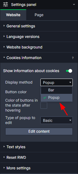 Attention! If you want the cookies on your website to work in accordance with google consent mode v2, choose the pop-up cookie option.