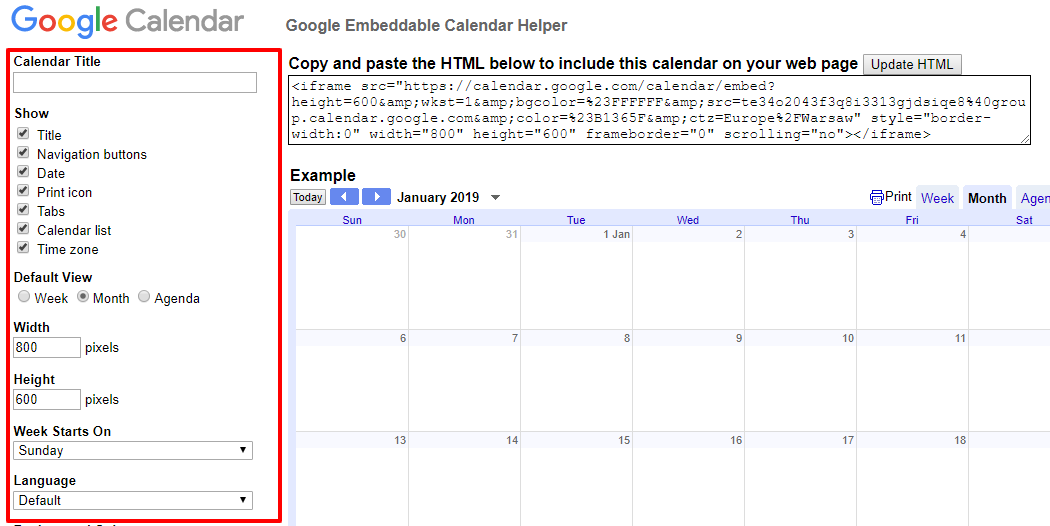 Keep in mind that a size of an HTML element can't be smaller than the width and height set previously in the calendar style (step 4).