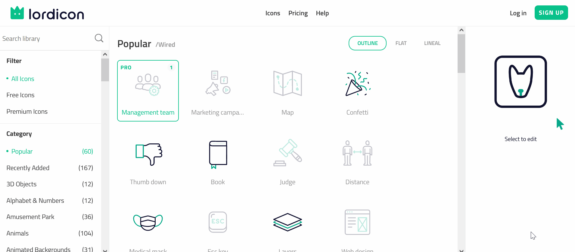 Go to the Lordicon website. On the left side, search for the icon you are interested in or find it by category.
