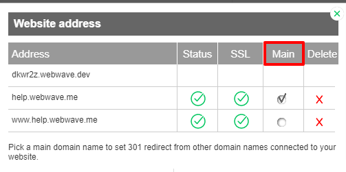 Luckily, using website builder WebWave CMS all you have to do is to add a domain to your website (Read more) and choose whether your domain has WWW or not. WebWave will automatically create all the necessary 301 redirects.