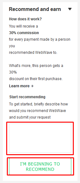 In addition, every person you recommend to WebWave to will recieve a 50% discount* on the purchase their first Paid Plan (Starter, Pro or Business Plan) which must be used within 7 days from registration of their Free Account.
