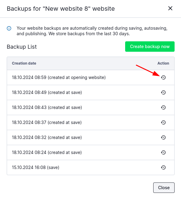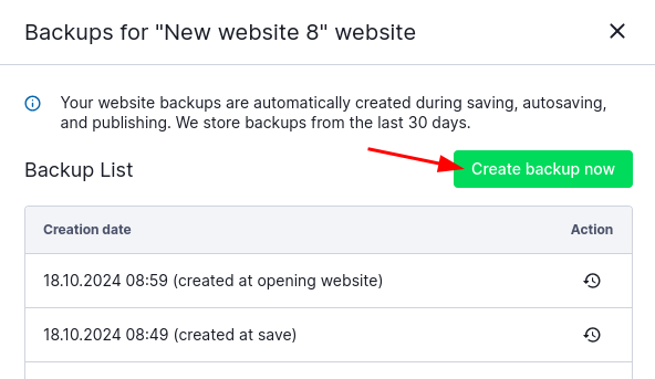 In WebWave - website builder with no coding - every day at 3:00 am a backup copy of all websites is made and is kept for 30 days. In addition, whenever you publish a website, backup copies are saved, so you can restore a website in the builder.